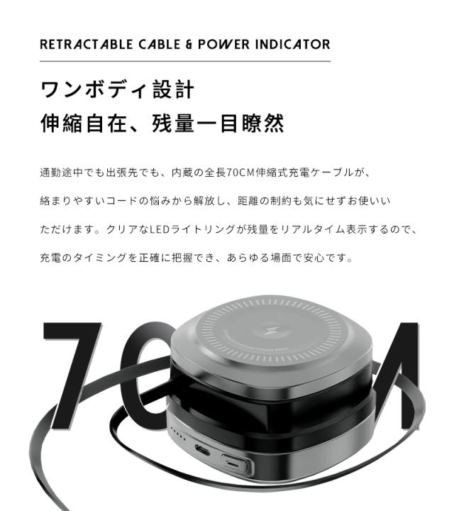 3.Type-C巻き取り式ケーブル内蔵、全長70cmで、使用時に軽く引っ張るだけで、最適な長さに調整可能です。未使用時はすっきり収納され、絡まりの煩わしさがありません。