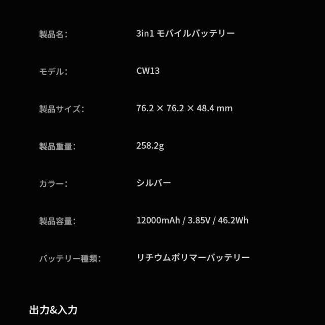 Type-C出力:最大45W(5V=3A/9V=3A/12V=3A/15V=3A/20V=2.25A)