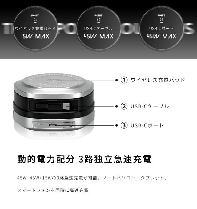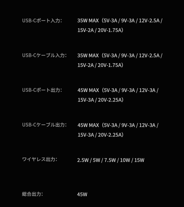 Type-Cケーブル出力:最大45W(5V=3A/9V=3A/12V=3A/15V=3A/20V=2.25A)