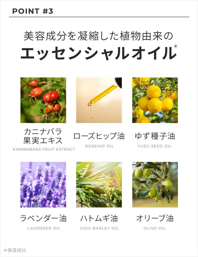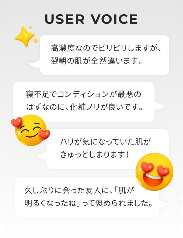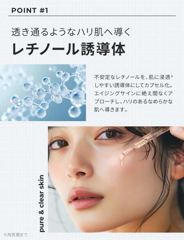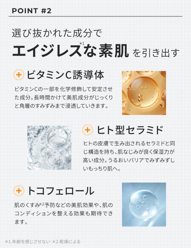 ビタミンC誘導体、レチノール、ヒト型セラミド、トコフェロールが輝き続ける素肌を引き出します。