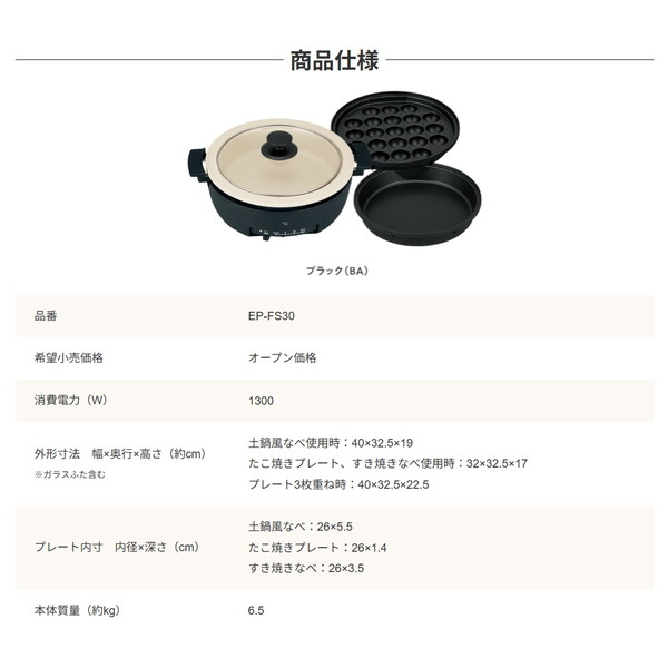 象印 グリル鍋 土鍋風なべ たこ焼きプレート すき焼きなべ 付 EP-FS30-BA