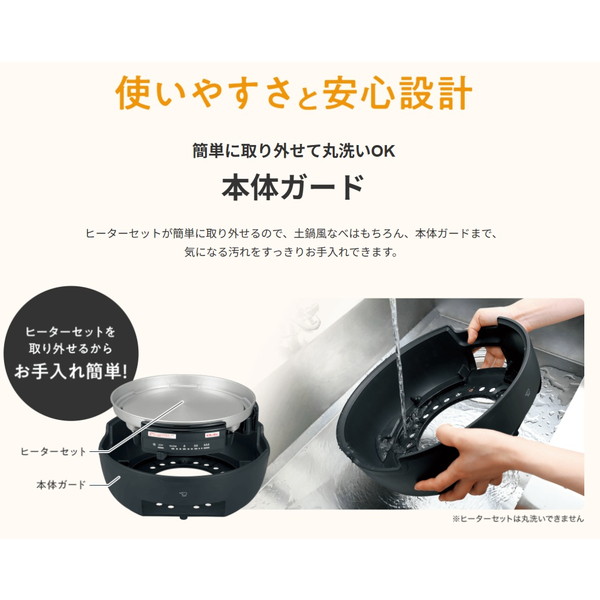 ヒーターセットが簡単に取り外せるので、土鍋風なべはもちろん、本体ガードまで、