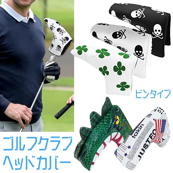 PUレザー ゴルフ パターカバー マジックテープ ベルクロ クラブカバー 保護カバー キズ防止 汚れ防止 ヘッド カバー ピンタイプ ドクロ スカル クローバー 四葉 合皮 裏起毛 刺繍 USA 恐竜 ユニーク