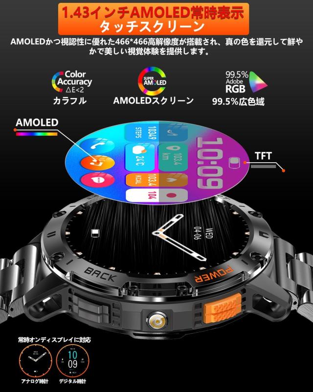 【卓越な品質と洗練されたデザイン1.43インチAMOLEDスマートウォッチ&常時表示&軍用規格】