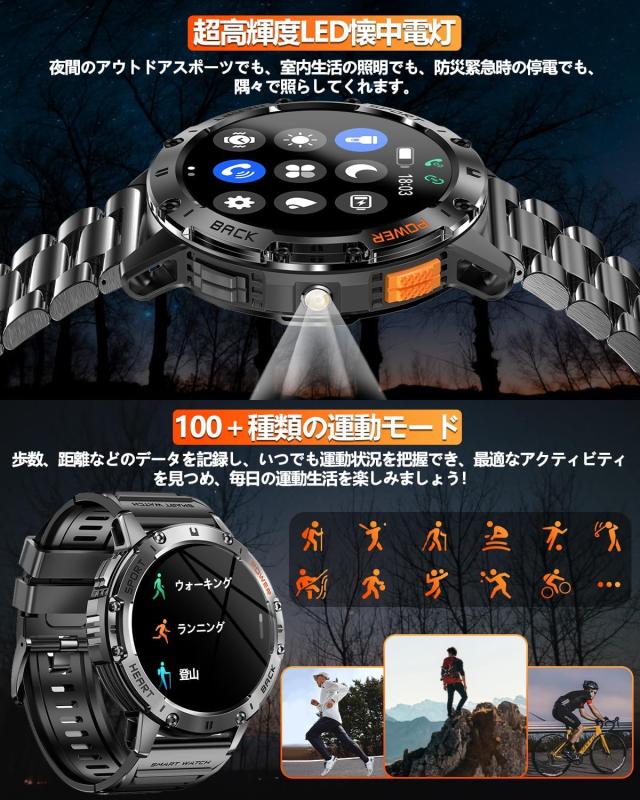 【懐中電灯機能・緊急時(防災・停電)にも役に立つ&手首に装着する100種類以上の運動モード&IP68防塵防水】