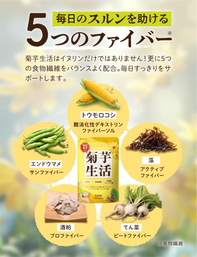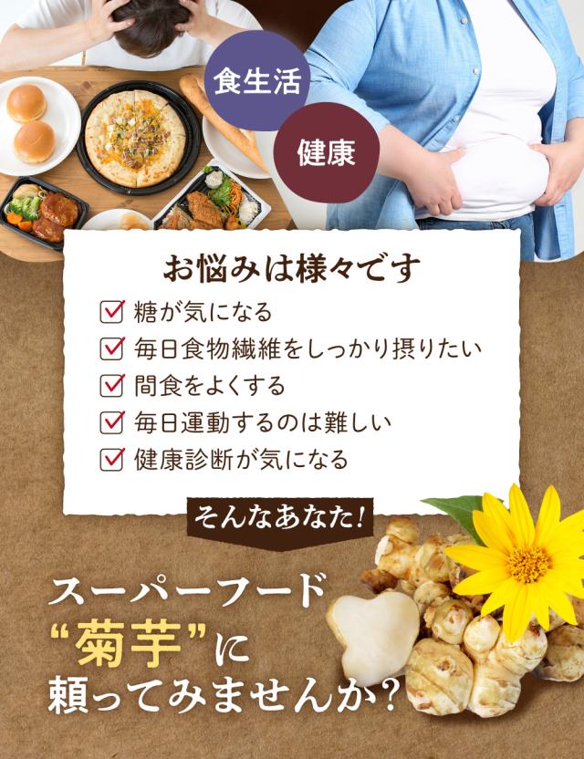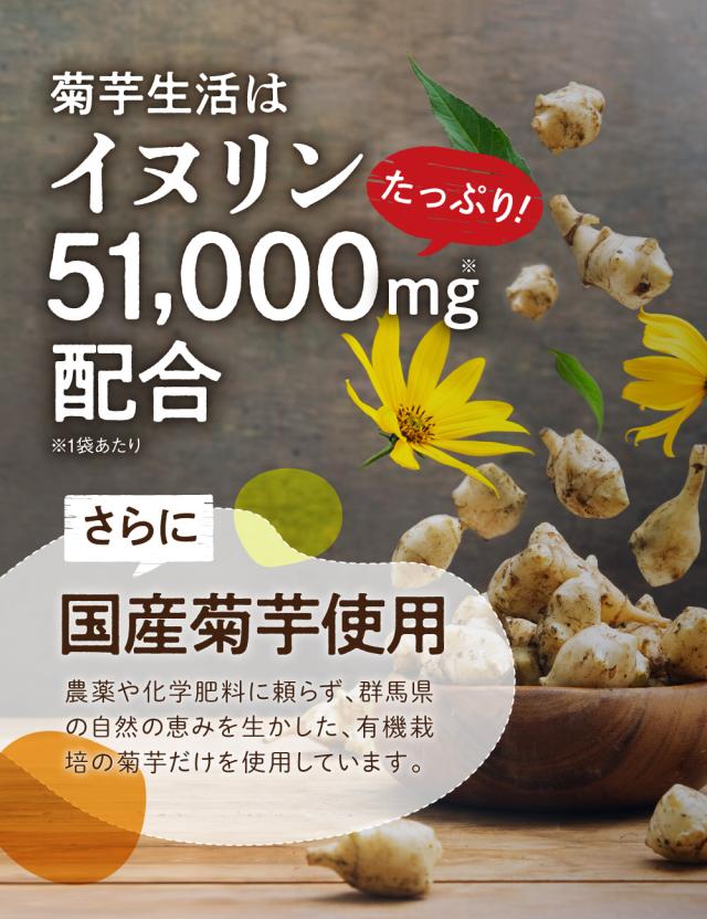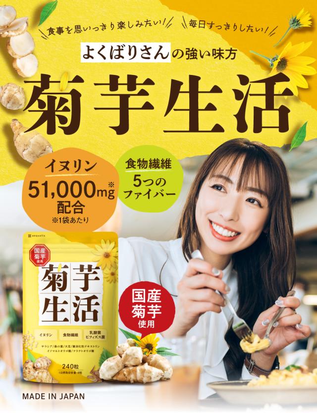 「食事を思いっきり楽しみたい!」「毎日スッキリしたい!」そんなよくばりさんの強い味方の菊芋サプリメント「菊芋生活」.