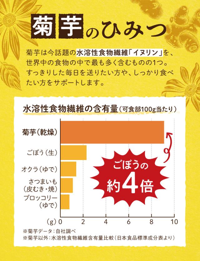 ・菊芋は今話題の水溶性食物繊維「イヌリン」を、世界中の食物の中でも最も多く含むものの1つ。水溶性食物繊維尾含有量は、ごぼうの約4倍!スッキリした毎日を贈りたい方や、しっかり食べたい方をサポートします。