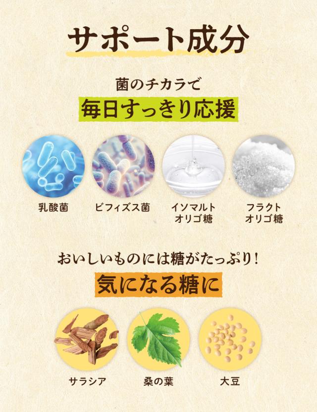 イヌリン(タイ製造)、有機菊芋末、マルチトール、有胞子性乳酸菌、サラシアエキス末、桑の葉末、ビートファイバー、グァーガム分解物、褐藻抽出物、酒粕発酵物、難消化性デキストリン、イソマルトオリゴ糖、フラクトオリゴ糖、大豆末、乳酸菌混合末(乳成分を含む)、植物性乳酸菌(殺菌)/セルロース、ステアリン酸カルシウム、二酸化ケイ素