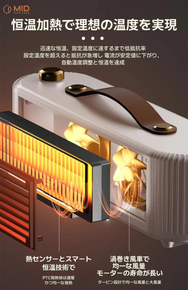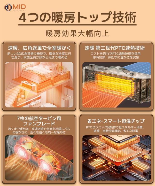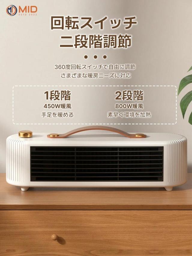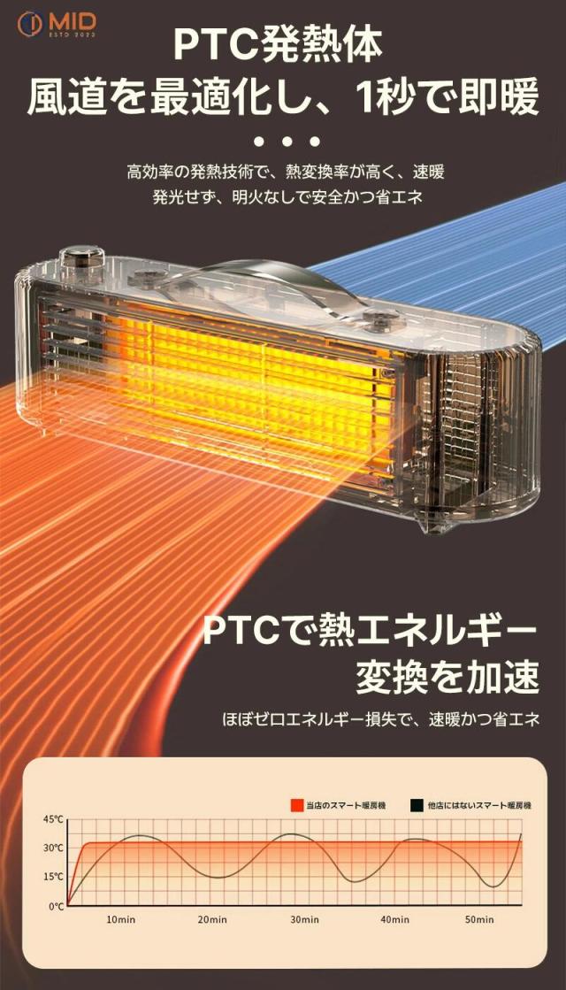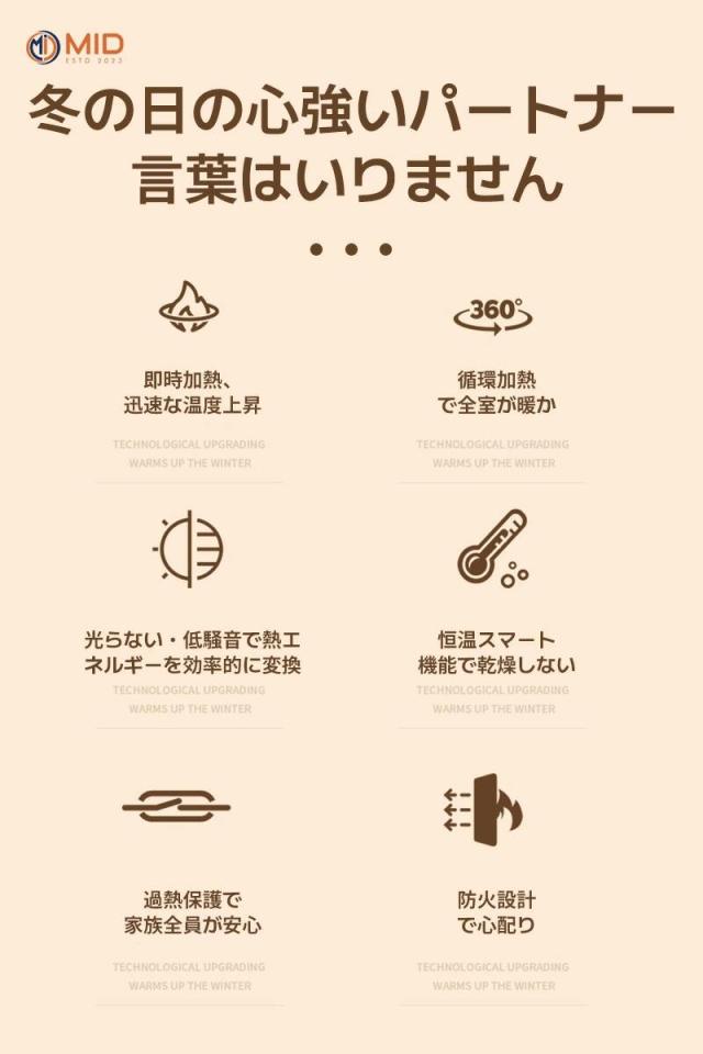 このMID暖房機は、安心して使用できる多重安全保障機能を備え、どこでも簡単に持ち運べる便利なデザインです。