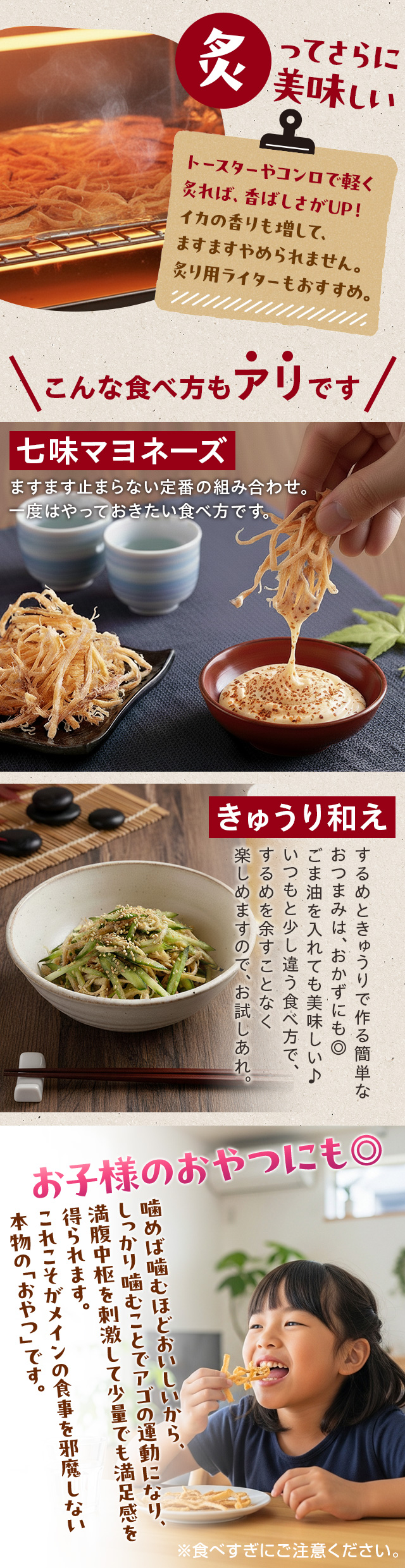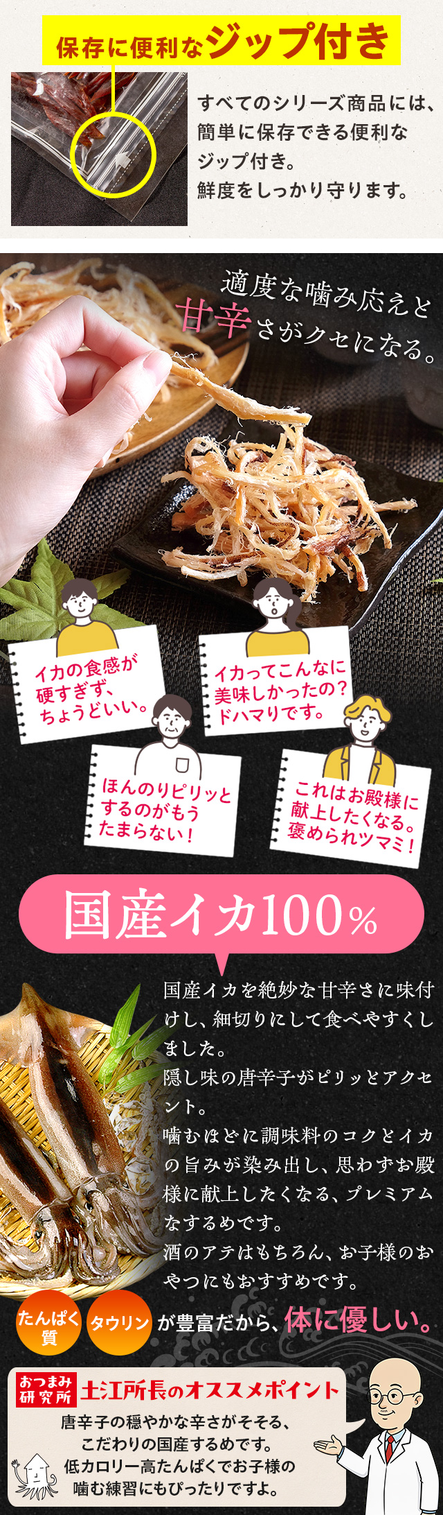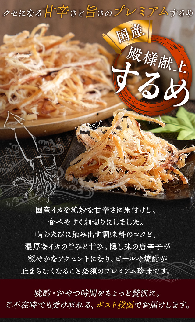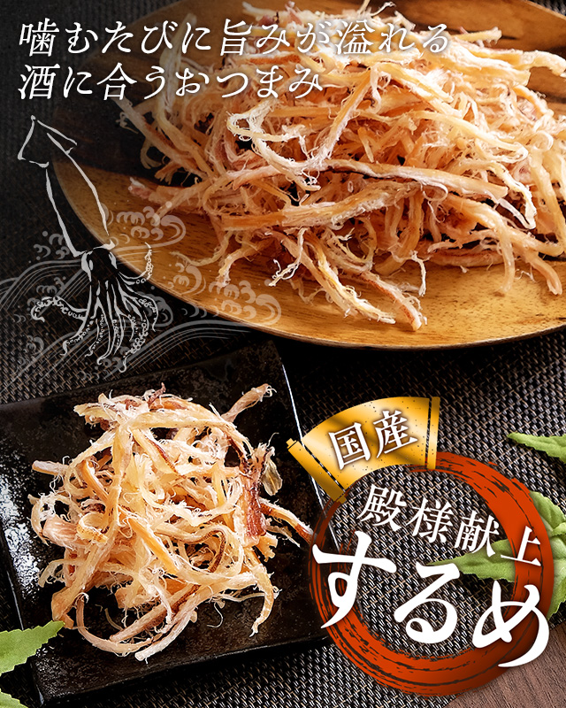 国産イカを食べやすい細切りにした程よい噛み応えのスルメは、思わずお殿様に献上したくなる美味しさ。噛むたびに染み出す調味料のコクと、濃厚なイカの旨みと甘み。隠し味の唐辛子が穏やかなアクセントになり、お酒が止まらなくなること必須のプレミアム珍味です。