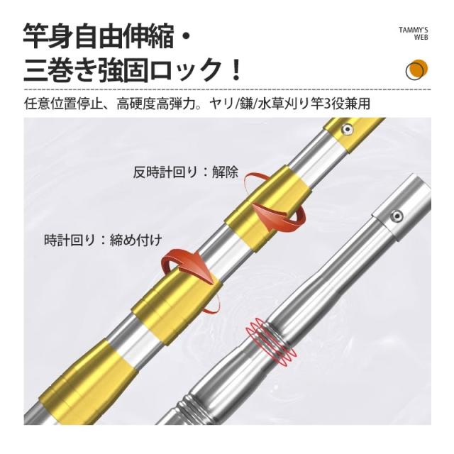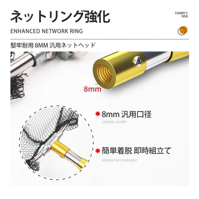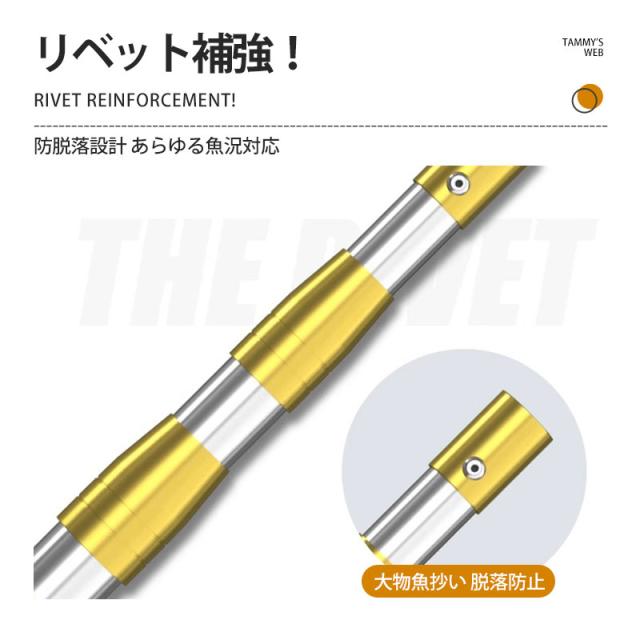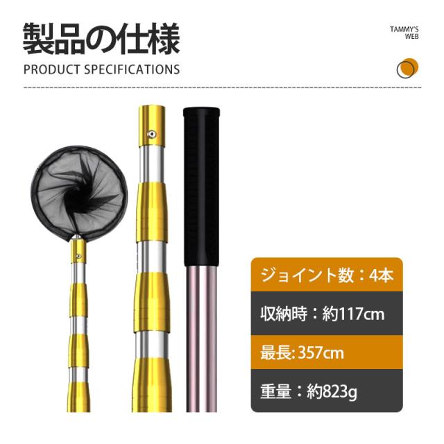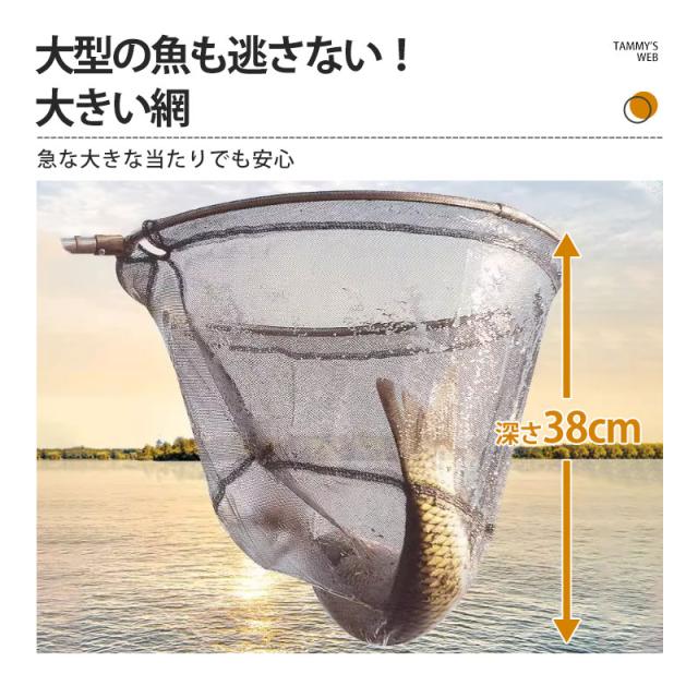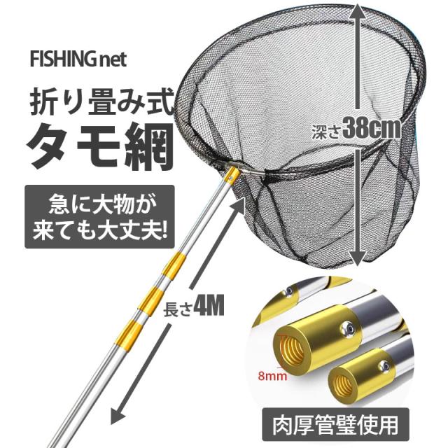伸縮式4Mタモ網、重量:760g、網の深さ:38cm、淡水海水適用、全魚種対応。