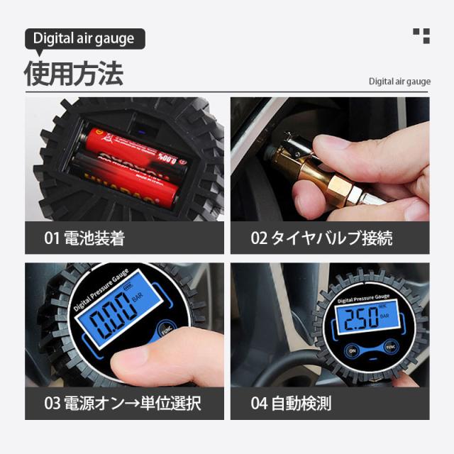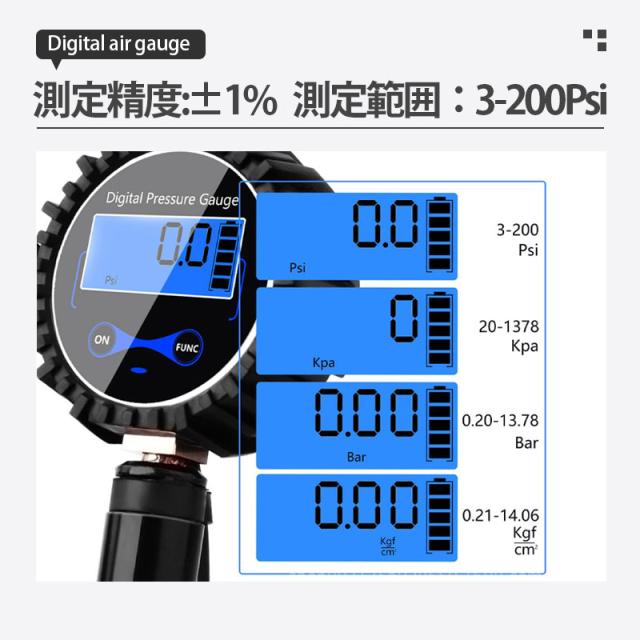 【測定範囲】精度:±1%;3〜200PSI/1424KPA/14.2BAR/14.5Kgf/cm2 4つの測定単位が対応可能