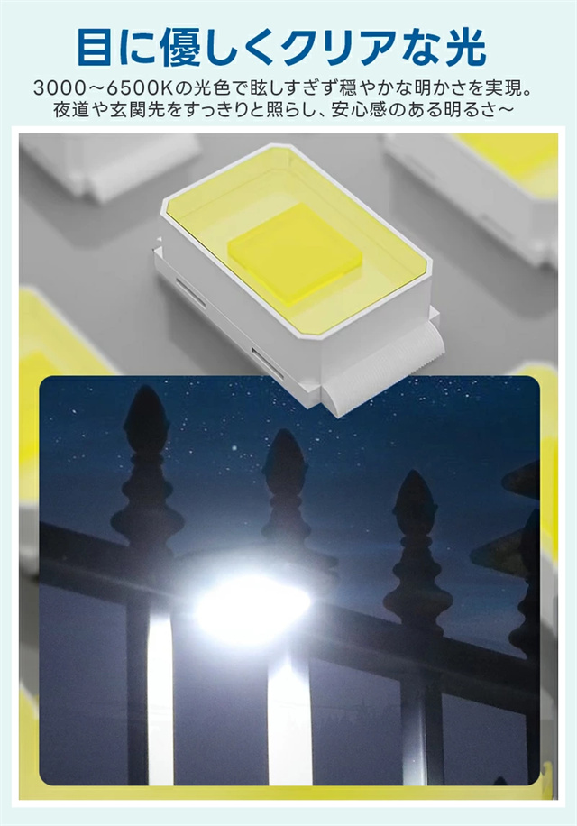 | ポイント | 【簡単取り付けでどこでも設置】 工具や穴あけ不要!クリップで挟むだけで簡単に設置できるソーラーライトです。 さらにネジ固定にも対応しており、より安定した設置も可能です。 庭先や玄関、フェンス、キャンプや旅行先など、さまざまな場所で手軽に設置可能。 【選べる3タイプの光】 タングステンランプ、COBランプ、LEDランプの3種類があります。 それぞれの色温度が異なり、お好みに合わせて選べます。 アンティーク感のある温かい光が玄関や庭先をやさしく照らし、落ち着いた雰囲気を演出します。 明るい昼白色も、眩しすぎない自然な光を実現◎ 【ソーラーパネル充電式】 電気代0円で省エネ! 昼間に太陽光で自動充電し、夜間は自動でライトが点灯。暗い場所でも安心して照らします。 【広範囲人感センサー&耐久性抜群】 120°の広角検知&3mの距離をしっかりカバー! 人の動きを感知すると明るく点灯し、暗がりでも安心・便利に使えます。 高強度ABS素材と生活防水機能で、雨でも安心。 【選べる3つの点灯モード】 3種類の点灯モードを搭載! 人感センサー+消灯/人感センサー+弱光常時点灯/常時点灯など、 シーンや用途に合わせて切替可能、玄関・駐車場・庭など幅広い場所で活躍します。 |