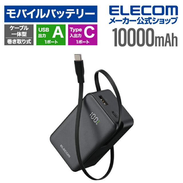エレコム モバイルバッテリー 巻き取り式 ケーブル一体型 10000mAh 22.5W リチウムイオン電池 巻取り式ケーブル一体 残量表示 Type-Cケーブル Type-C USB-A ブラック┃EC-C53LBK