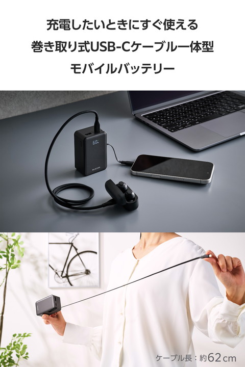 スッと伸ばして、くるっと収納!持ち運びに便利な本体一体型の巻き取り式USB Type-C(TM)ケーブルを備えたモバイルバッテリーです。容量10000mAhで外出先でも安心して充電できます。ケーブルを持ち忘れる心配がなく、必要な長さに調節して使用できます。
