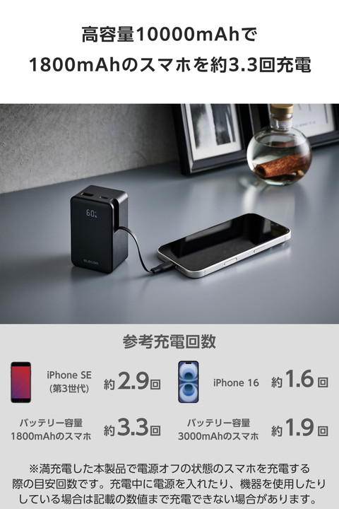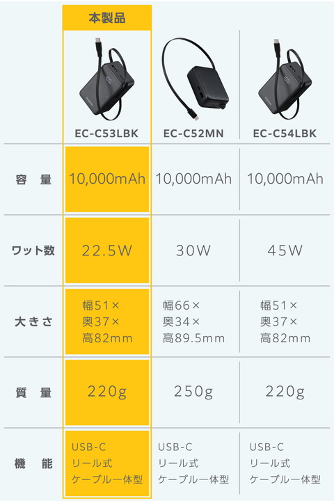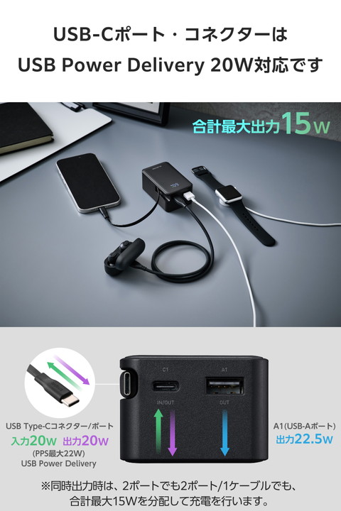 スッと伸ばして、くるっと収納!持ち運びに便利な本体一体型の巻き取り式USB Type-C(TM)ケーブルを備えたモバイルバッテリーです。容量10000mAhで外出先でも安心して充電できます。ケーブルを持ち忘れる心配がなく、必要な長さに調節して使用できます。![]() ■本体一体型の巻き取り式USB Type-C(TM)ケーブルを備えた、容量10000mAhのモバイルバッテリーです。 ■本体一体型ケーブルは巻き取り式のため、使用後はケーブルを巻き取って、すっきりと収納可能。ケーブルの長さは約62cmあり、必要な分だけ引き出して充電しながらスマートフォンを使用できます。 ■一体型のUSB Type-Cケーブルに加え、USB Type-Cポート×1とUSB-Aポート×1も搭載しています。 ■※複数の機器を同時に充電する場合は、1ポート/1ケーブルあたりの出力が低下するため、ご使用の機器によっては充電できない場合があります。 ■※同時出力時は、2ポートでも2ポート/1ケーブルでも、合計最大15Wを分配して充電を行います。 ■最大出力は22.5Wなので、スマートフォンを充電できます。外出先での急なバッテリー切れでも安心です。 ■※USB-Aポートの単独出力時に限ります。 ■※USB-Aポートの出力22.5Wは、HUAWEI機器のみに対応しています。 ■一体型ケーブルもしくはUSB Type-Cポートから、USB Power Delivery 最大20Wの出力が可能です。スマートフォンやタブレットを充電できます。 ■※PPS適用時は最大22Wの出力が可能です。 ■モバイルバッテリーはUSB Type-C充電式です。AC充電器に接続して充電してください。 ■※AC充電器は同梱しておりません。別途ご購入またはご用意ください。 ■※AC充電器は20W以上を推奨します。20W未満のAC充電器で充電した場合や、USB Type-C - USB-Aケーブルで充電した場合、パッケージやHPに記載の時間では満充電にならない場合があります。 ■本体充電用ケーブルを接続したままで、モバイルバッテリーとスマートフォンをまとめて充電できる”まとめて充電”に対応しています。 ■※本製品はパススルー充電に対応しており、バッテリーを介さずに充電器から接続機器へ直接充電するため、電池の劣化を抑えられます。 ■低電流モードによりBluetooth(R)ヘッドセット・イヤホンなどの小型電子機器を最適な電流で充電できます。 ■※USB-Aポートのみ対応します。 ■接続機器を見分けて最適な充電を行う”おまかせ充電”に対応しています。 ■※USB-Aポートのみ対応します。 ■USB Power Delivery(PD)規格およびPPS規格に対応。接続機器に応じて電圧や電流を自動調整するため、iPhoneなどのスマートフォンやタブレット等を効率的に充電できます。 ■※USB Power Deliveryとは、アダプターと接続機器間で情報をやり取りすることで、その機器間における最適な電力を選択し、高速充電を実現するUSB規格です。PPS(Programmable Power Supply)とは、0.02V単位で電圧を調整し、最適な電力で効率的に供給することができるUSB Power Deliveryのオプション規格です。 ■本製品(バッテリー容量10000mAh)で、1800mAhのスマートフォンを約3.3回、3000mAhのスマートフォンを約1.9回充電可能です。 ■※満充電した本製品で電源オフの状態のスマートフォンを充電する際の目安回数です。充電中に電源を入れたり、機器を使用したりしている場合は記載の数値まで充電できない場合があります。 ■LEDパネルでバッテリー残量を1%単位で確認しながら使えます。事前にモバイルバッテリーを充電する際などに便利です。 ■NINTENDO SWITCH(TM) 2/NINTENDO SWITCH(TM)/NINTENDO SWITCH Lite(TM)対応です。 ■※ドックでの使用に対応していません。 ■約1000回繰り返し使用可能な充電式リチウムイオン電池を搭載しています。 ■Thermal Protectionを搭載し、製品温度の上昇を監視・制御。自動で出力をコントロールし、お使いの機器を守ります。 ■過充電・過放電・過電流防止機能および短絡保護機能と温度検知機能の5つの保護機能を備えた安心の回路設計です。 ■電池容量が160Wh(43,243mAh)以下であるため、機内持ち込みも可能です。 ■※航空会社の規定によって例外がある場合があります。 ■日本の電気用品安全法(PSE)の技術基準に適合した安全性の高い商品です。 ■内蔵の充電式リチウムイオン電池は、JIS C 62133-2:2020およびJIS C 8715-2:2024に準拠した安全設計です。 ■※工場出荷時に70%程度充電されています。充電式リチウムイオン電池は時間とともに放電するので、ご使用になる前に充電することを推奨します。 ■※ケーブルを挿したままにしておくとバッテリーの残量が減ってしまいます。使用しないときは、必ずケーブルを外してください。 ■※一体型USB Type-CケーブルおよびUSB Type-Cポートのいずれからも本製品を充電できますが、同時に入力することはできません。 ■※USB Type-C and USB-C are trademarks of USB Implementers Forum. ■本製品は、一般社団法人JBRCの回収対象製品であり、回収協力自治体や協力店(家電量販店・ホームセンターなど)で回収が可能です。 ■※JBRCのホームページでお住まいの地域の回収協力自治体・協力店をご確認