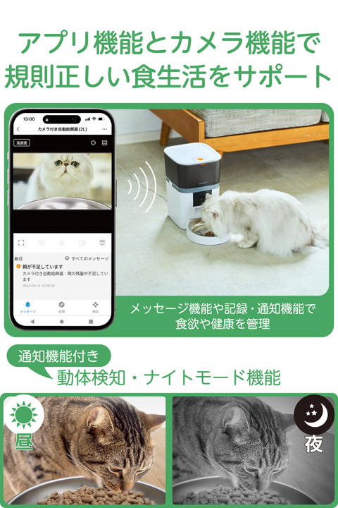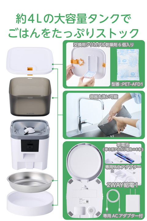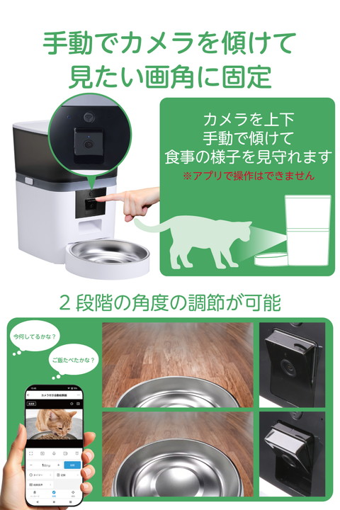 飼い主の留守中も見守れて安心!スマホアプリからリアルタイムで、愛犬・愛猫の様子を確認できるカメラ付き自動給餌器です。ごはんの量や回数を細かく設定でき、外出中でも規則正しい食生活をサポートします。約4Lの大容量タンクで、不在が続くときもごはんをたっぷりストックできます。![]() ■スマホアプリからリアルタイムで愛犬・愛猫の様子を確認できる、2段階の角度調節が可能なカメラ付き自動給餌器です。ごはんの量や回数を細かく設定でき、外出中でも規則正しい食生活をサポートします。 ■スマートフォンから簡単操作で、遠隔でごはんをあげたり、音声機能で話しかけたりすることもできます。外出先でも大切な家族の様子を気にかけてあげられるので、安心して過ごせます。 ■最大10秒間の音声録音も可能で、ごはんの時間を飼い主の声で知らせることができます。飼い主の声といつものごはんで、ペットが安心して食事ができる環境を届けてあげられます。 ■食事を見守りながら、愛犬や愛猫の様子を写真や動画で撮影可能。時系列で保存されるので、日々の食事記録にも便利です。 ■今日の様子から1カ月の傾向まで、給餌記録を日・週・月で簡単チェック。グラフ表示で増減や偏りがひと目でわかるので、毎日の食事リズムをしっかり見守れます。 ■昼間はもちろん、夜や暗い場所でもナイトビジョンモードでペットの様子がしっかり見られるので、24時間いつでも大切な家族を見守ることができます。 ■アプリとのWi-Fi接続は、2.4GHzと5GHz両方に対応。電子レンジなどの電波干渉を受けにくい5GHzと、障害物に強い2.4GHzのどちらでも接続できるので、ご使用環境での通信トラブルを最小限に抑えます。 ■※Wi-Fi環境下で使用する製品です。購入前に設置場所がWi-Fiに接続できる環境であることをご確認ください。 ■給餌の時間・量・回数をスマホアプリから細かく設定可能。フードを約7g単位で小分けに設定でき、愛犬・愛猫のちょうどいい量を出せるので、肥満対策や早食い・吐き戻し防止に役立ちます。 ■※給餌量の単位は「ポーション」で表示されます。1ポーションは約7±2gです。 ■※本製品はドライフード専用です。 ■動体検知機能を搭載しているので、ごはんを食べにきたことなどの通知が届きます。検知したときの撮影画像が通知欄に保存されるので、後からでもお留守番している様子が確認できて安心です。 ■※Wi-Fi通信環境により、本製品との接続が切れている状態では通知が届かない場合があります。 ■専用ACアダプターと乾電池(単3形アルカリ電池×4本)の両方で給電できます。併用することで、停電発生時や万が一コードが抜けてしまった場合も、時刻通りにごはんを提供できます。 ■※乾電池は非常用の予備電源となります。通常時は乾電池が入っていても、必ず付属の専用ACアダプターをご使用ください。また、乾電池で作動している場合、ネットワーク機能はご利用できません。 ■※乾電池は付属していません。別途ご用意ください。 ■AC電源からの給電が停止しても、乾電池を補助電源としてセットしておくと設定済みの現在時刻・給餌設定が保持され、再設定の必要がありません。 ■※乾電池をセットしていない場合は、現在時刻がリセットされます。 ■約4Lの大容量タンクで、旅行や出張などで不在が続くときでも、ごはんをたっぷりストックできて安心。半透明のフードタンクで残量を一目でチェックできます。 ■フードタンクは本体から取り外して水洗いできます。フードボウルは汚れ・傷がつきにくいステンレス製で、いつでも清潔を保てます。 ■フードタンク蓋裏の乾燥剤ポケットに乾燥剤をセットできます。ドライフードを湿気から守って、いつでもカリカリをキープします。 ■※交換用シリカゲル乾燥剤6個入り(型番:PET-AFD1)が使用できます。 ■フードが詰まった場合や、残量が低下するとアプリを通じて通知されるので、早めに帰宅するなどの予定が立てられて便利です。 ■万が一倒れてもフードがこぼれにくい蓋ストッパー付き。いたずらや盗み食い防止にもなります。 ■給電ケーブルはメッシュタイプを採用。ケーブルの外部被覆(シース)はナイロン製で、噛みつきやいたずらによる断線が起きにくい構造です。 ■自社環境認定基準を1つ以上満たし、『THINK ECOLOGY』マークを表示した製品です。 ■環境への負荷軽減のため、輸送効率を高める設計の外装箱を使用した製品です。 ![]() ■定格電圧:DC5V(USB給電入力) ■消費電力:作動時:約3.5W、待機時:約2W ■コネクター形状:USB Type-C(TM)ポート ■無線周波数:2.4GHz/5GHz(W52) ■カメラ解像度:1920×1080P(15fps) ■フードタイプ:ドライフード専用 ■フードボウル:1個(1匹用) ■最大容量(重量):約4L/約2.2kg ※重量は目安です。フードの形状や密度、保存環境などにより変動します。 ■材質:本体・フードタンク・蓋・トレイ:ABS、フードボウル:ステンレス ■サイズ:幅約192mm×奥行約213mm×高さ約281.5mm(フードボウル含まず)、幅約19