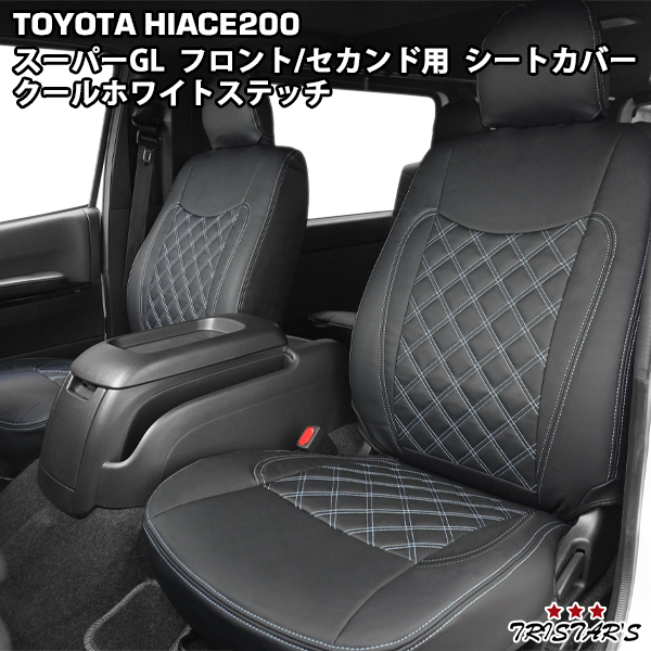 200系 ハイエース スーパーGL S-GL 専用 1型〜8型対応 ダイヤカットデザイン シートカバー フロント・セカンド用 (クールホワイトステッチ)
