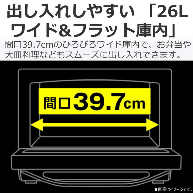 ■大皿料理の出し入れもしやすい「26Lワイド&フラット庫内」間口39.7cmのひろびろワイド庫内で、お弁当や大皿料理などもスムーズに出し入れできます。