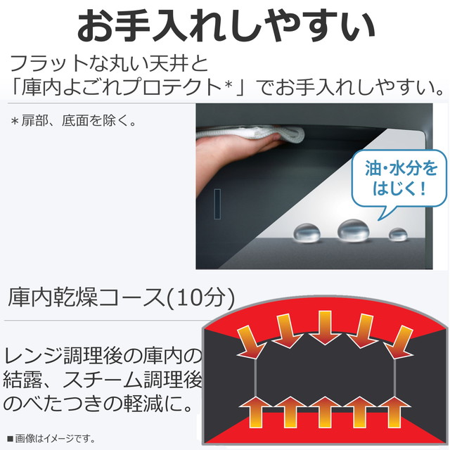 ■「フラットな丸い天井・四隅も丸い庫内」と「庫内よごれプロテクト※」でお手入れしやすい。