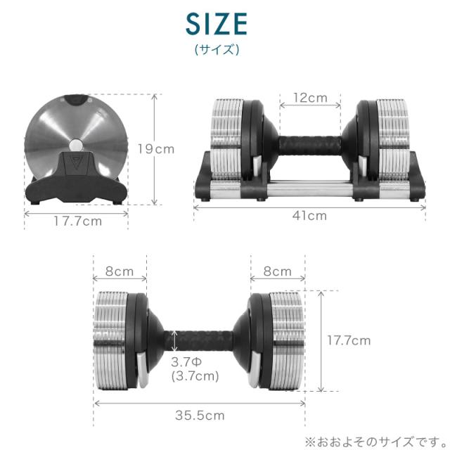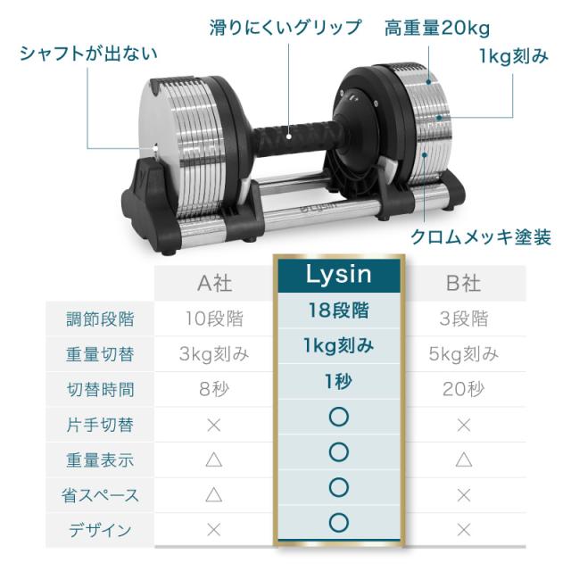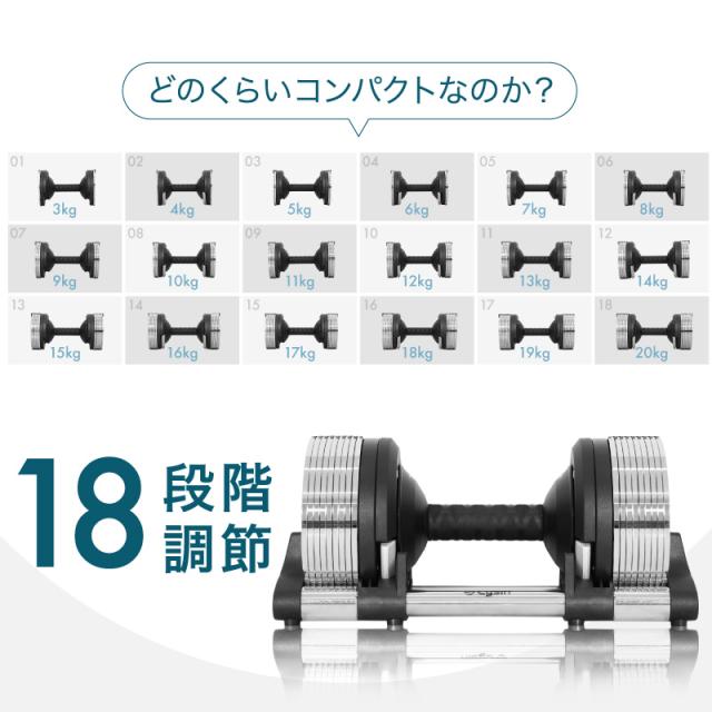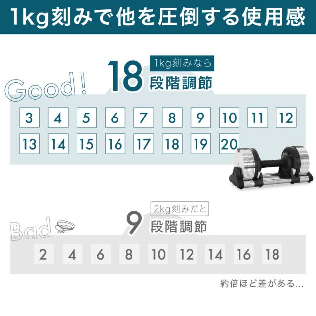 【仕様】 メタル クロムメッキ クロームメッキ プレート 面取り加工 高重量 高精度 精密 1kg重量切替 可変式ダンベル 18段階 重量 調節可能 アジャスタブル 握りやすいグリップ 省スペース