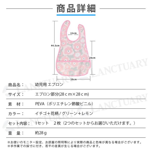| 主な仕様 | 商品名: 幼児用 エプロン 素材:PEVA(ポリエチレン酢酸ビニル) セット内容: Aセット(いちご+花柄)Bセット(グリーン+レモン) 重量:約28g サイズ:エプロン部分(28cm×28cm) |