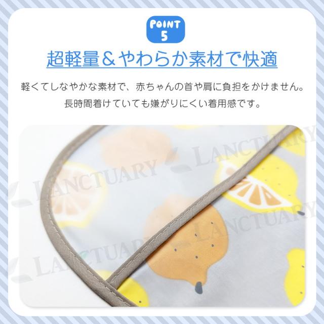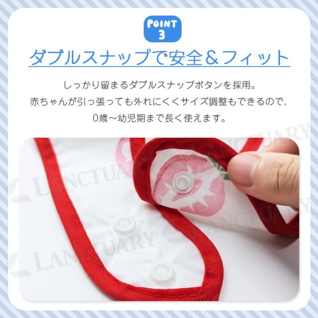 首元はダブルスナップボタンを採用しており、ひもを結ぶ必要がない安全設計。着脱がスムーズで、お子さまが動き回る時でも簡単に装着できます。柔らかく軽い素材を使用しているため、赤ちゃんの首や肩に負担がかかりにくいのも特徴です。