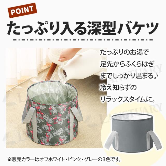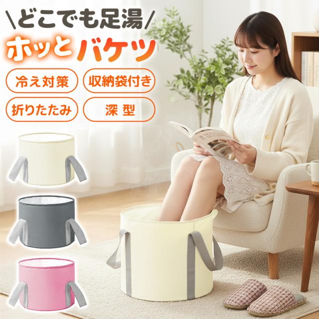 | 商品の説明 | これからの季節の冷え対策や長時間の外出で足が疲労している時などにおすすめです。 自宅で簡単にできるフットケア。リラックスタイムをより快適にできる足湯バケツが登場しました! 足湯バケツは自宅で温泉気分を味わいながらフットケアができます。 使い方は簡単でバケツにお湯を入れ、足を温めるだけ。 深型バケツで足裏や足首をしっかり温めてくれ、次第に体もぽかぽかに◎ 硬めの側面、補強テープで自立性が高く、お湯を入れてもぐらつかず安心してご使用いただけます。 また100°対応のEVAなど多重構造でしっかり耐熱、防水。 お手入れも簡単でサッと拭くだけでOKです。 両サイドに持ち運びに便利な取っ手がついているのでお湯を入れて運ぶ時や、使用後にお湯を捨てる時など持ち手を持って移動可能です。 バケツの底に吊り下げ紐があり使用後はサッと拭いて吊り下げ乾燥ができます。 バケツは簡単に折りたためるので小さくコンパクトに! 収納袋もついているので収納時や持ち運び時も便利です。 足湯以外にもフットバス、お掃除、アウトドア、介護など多用途でご使用いただけます。 普通のバケツだと持ち運びに場所を取りますが、コンパクトになるので外出先でもおすすめです。 あると便利な足湯バケツ、この機会にぜひお試しください! |