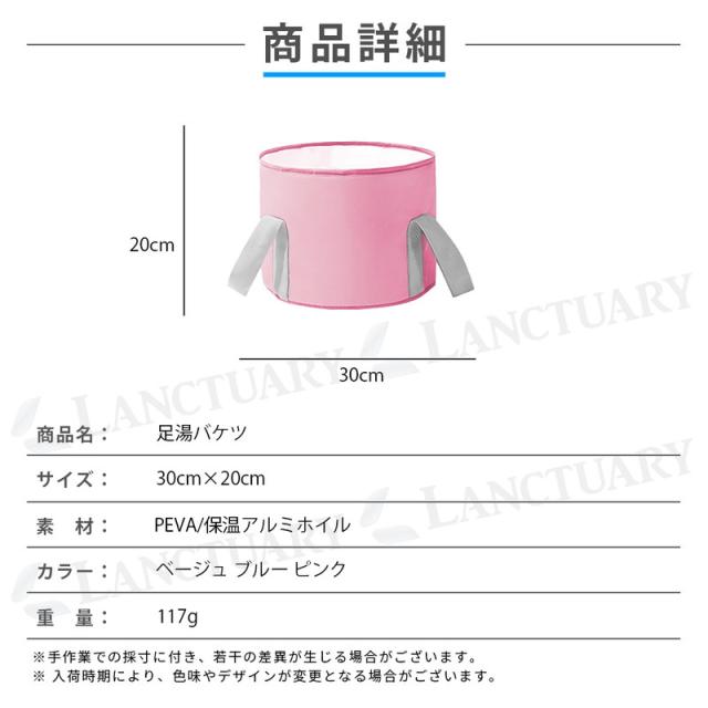 | 主な仕様 | 商品名:足湯バケツ 素材:PEVA/保温アルミホイル サイズ:幅30cm×高さ20cm カラー:ベージュ ピンク ブルー 重量:117g |