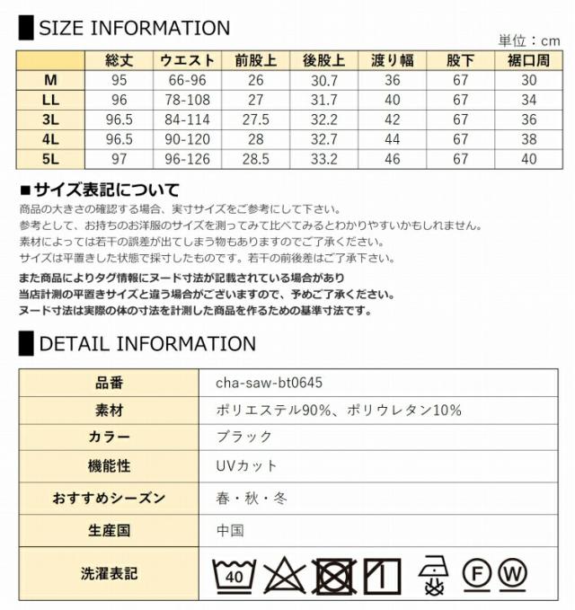 | 単位:cm | 総丈 | ウエスト | 前股上 | 後股上 | 渡り幅 | 股下 | 裾口周 |