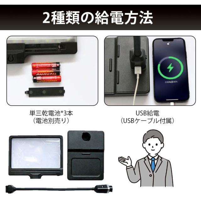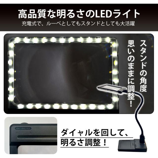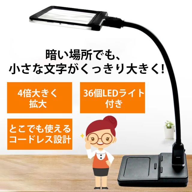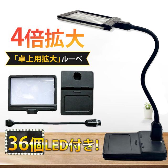 拡大鏡 スタンド ルーペ LEDライト付き 卓上型 読書用ルーペ 読書サポート 4倍 ハンズフリー 携帯用 作業用 新聞 手芸 敬