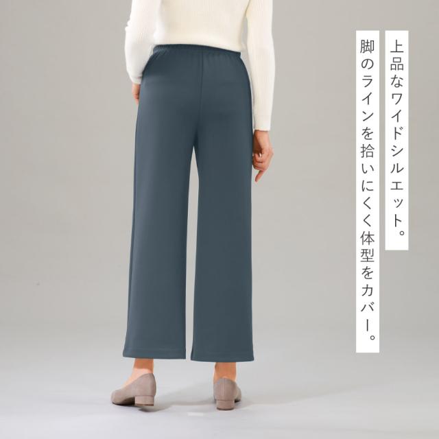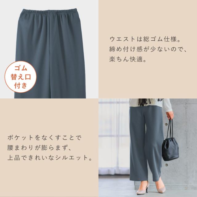 見た目はすっきり上品なワイドシルエットで、脚のラインを拾いにくく自然に体型をカバーしてくれるのも嬉しいポイント。ポケットを付けないことで腰まわりが膨らまず、きれいなラインで履いていただけます。