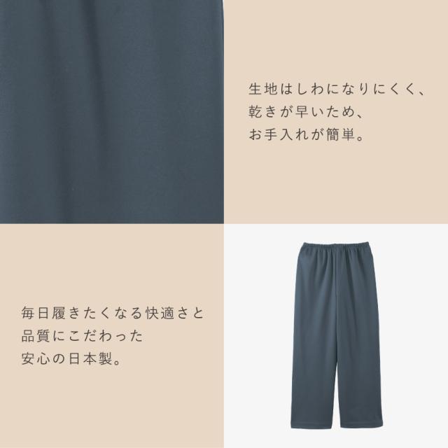 素材はシワになりにくく、洗っても乾きやすいため、お手入れも簡単。旅行や通院、室内着、ちょっとした外出にも使える便利な一本です。