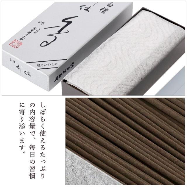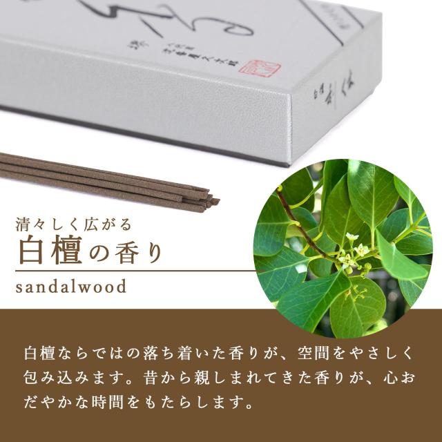白檀の香りは、古くから仏教や神道など神聖な場で重宝されてきました。和の香木らしいその落ち着いた香りは空間をやさしく包み込み、場を整え清らかにし、心おだやかな時間をもたらします。現代の忙しい日々にもそっと寄り添い、心安らぐ空間を作り出してくれることでしょう。