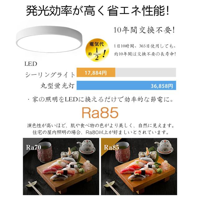 演色性が高いほどのシーリングライト、自然光に近いとされているので、文字がはっきりと見やすく、花の色や料理の色や人の肌色美しく自然に見えます。廊下、和室、寝室、洗面所、居間、書斎、トイレ、天井照明、キッチン照明が最適です。