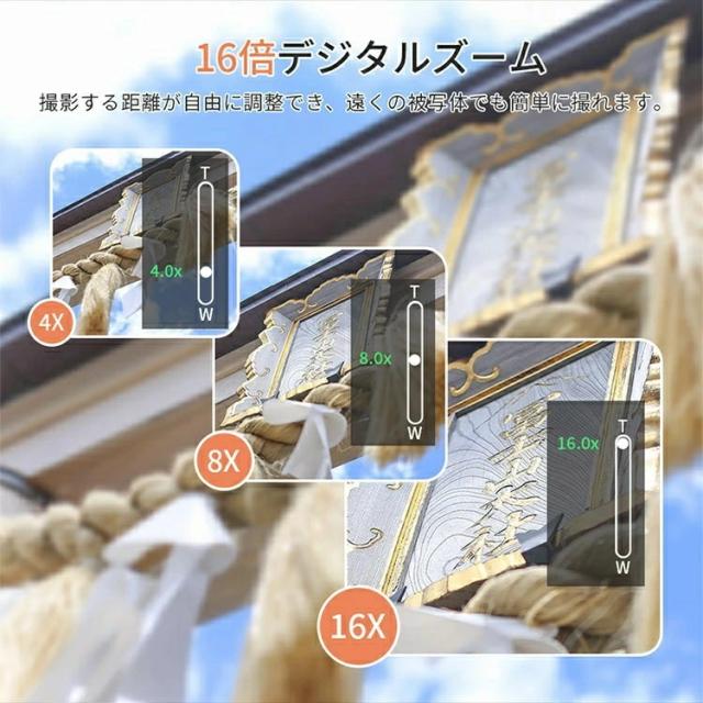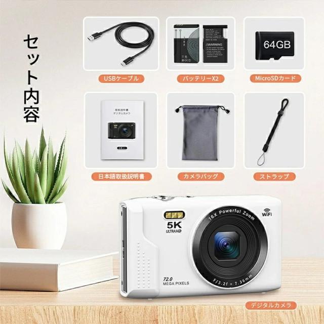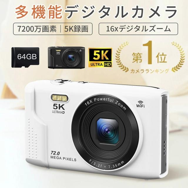 デジカメ WIFI対応 デジタルカメラ カメラ コンデジ 5K 日本製チップ 7200万画素 初心者向け デュアルレンズ スマホに送れる 64GBマイクロSDカード付き 16倍ズーム ウェブカメラ 子供用 修学旅行スマホ転送