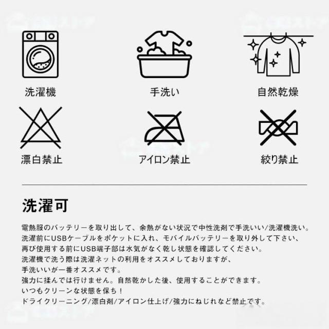 洗濯前にUSBケーブルをポケットに入れ、モバイルバッテリーを取り外して下さい、 再び使用する前にUSB端子部は水気がなく乾し状態を確認してください。