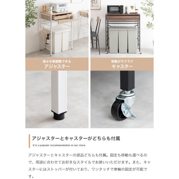 アジャスターとキャスターの部品がどちらも付属しているため、固定も移動もお選びいただけ、用途に合わせてお好きなスタイルでお使いいただけます。