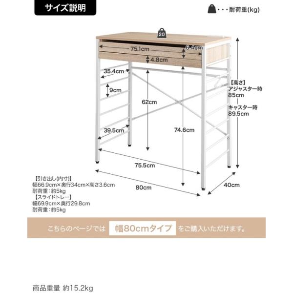 | サイズ | 幅80cm×奥行40cm×高さ(キャスター装着時):89.5cm (アジャスター装着時):85cm |