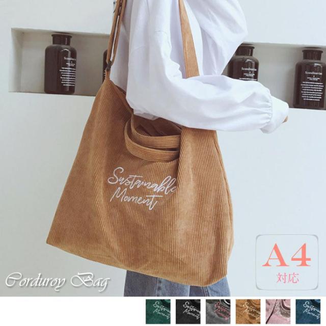 素材:コーデュロイカラー:ブラック/グレー/キャメル/ピンク/なんどいろ/ディープグリーン サイズ 【横】約42cm 【縦】約39cm 【マチ】約7cm 【持ち手】約11cm 【ショルダー】約50-95cm 重さ:約283g 裏地:あり 内ポケット:あり 生産国:中国 ショルダーベルト付きでトートバッグにもショルダーバッグにもなるデイリー使いにうれしい2WAY仕様なキャンバスバッグ 刺しゅう入りデザインはシンプルさにアクセントを加え、さりげなく女性らしい たっぷり入る大容量、抜群の収納力。通勤、通学やデート、ちょっとした小旅行など使いかたは十分に