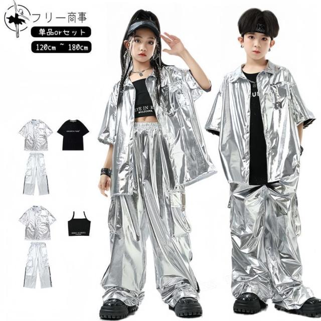 k-pop 衣装 シルバー キッズダンス衣装 セットアップ ヒップホップ シルバー コート キャミソール ロングパンツ 光沢 tシャツ スパンコール 韓国 カコイイ 男の