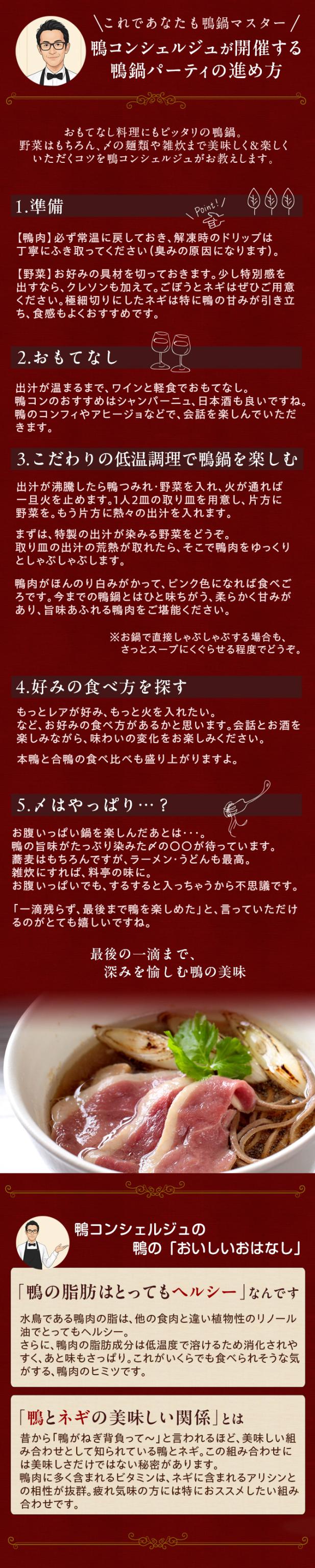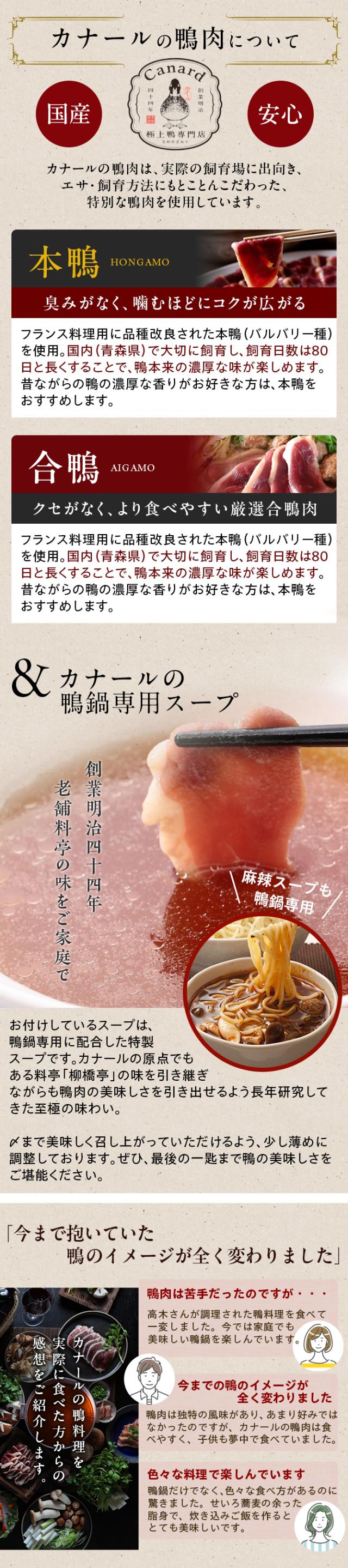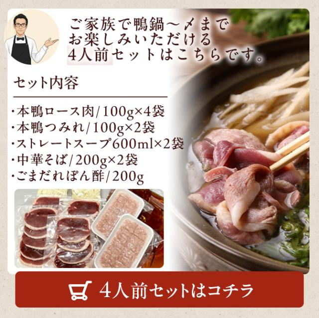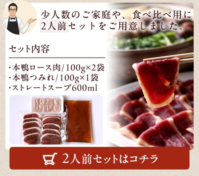 鴨鍋専門店が厳選した高級本鴨につみれ、スープが付いた2人前。こだわりのストレートスープが鴨や野菜の美味しさを一層引き立てます。