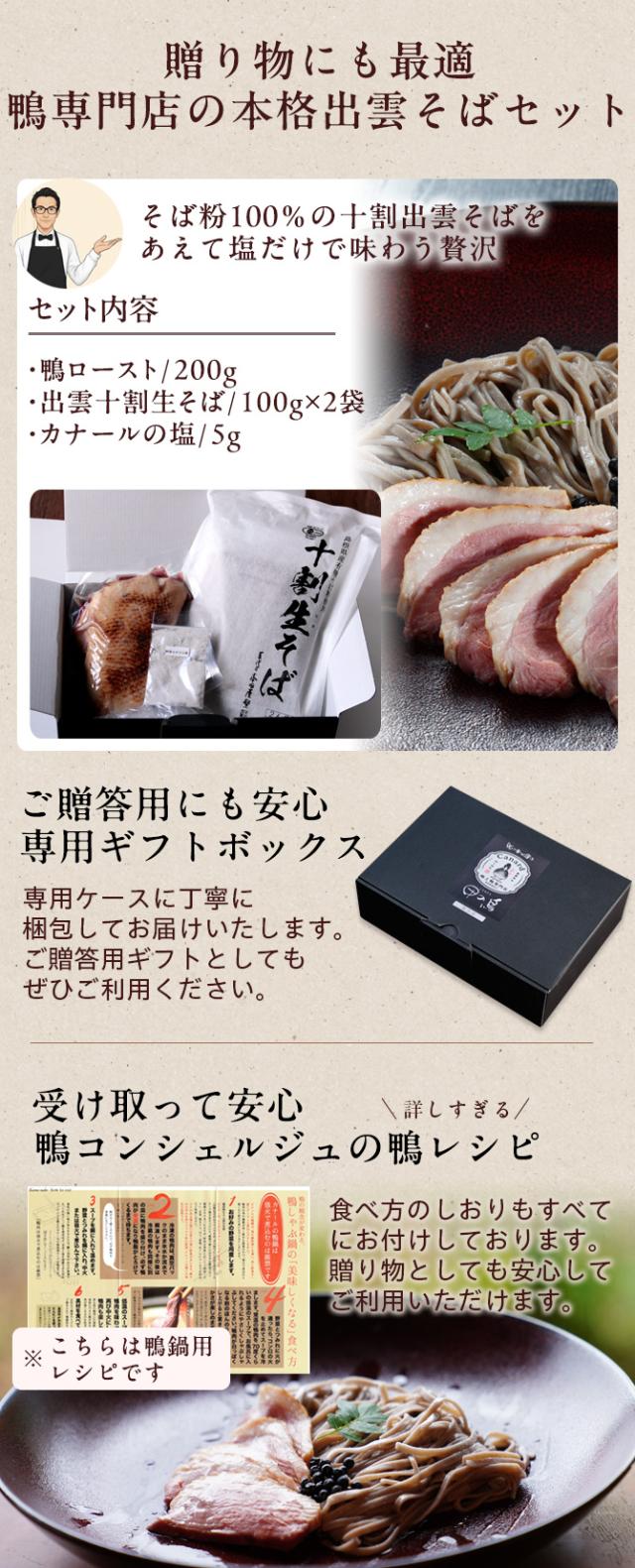 お歳暮 ギフト 塩で食べる十割出雲そば2人前 鴨ロースト添え 年越しそば ギフト 送料無料(北海道・沖縄を除く)