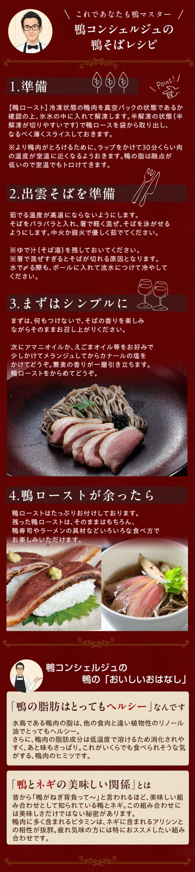 | 内容量 | 2人前(鴨ロースト200g、なまそば200g、調味塩5g) |
