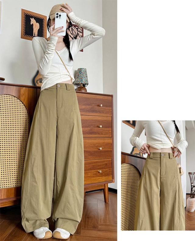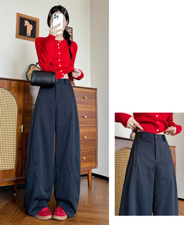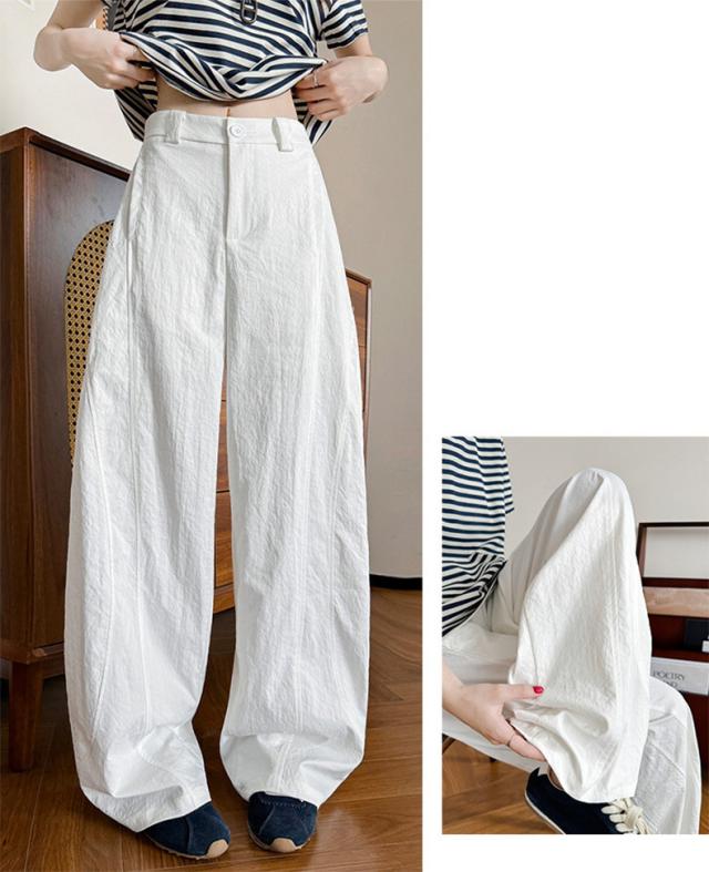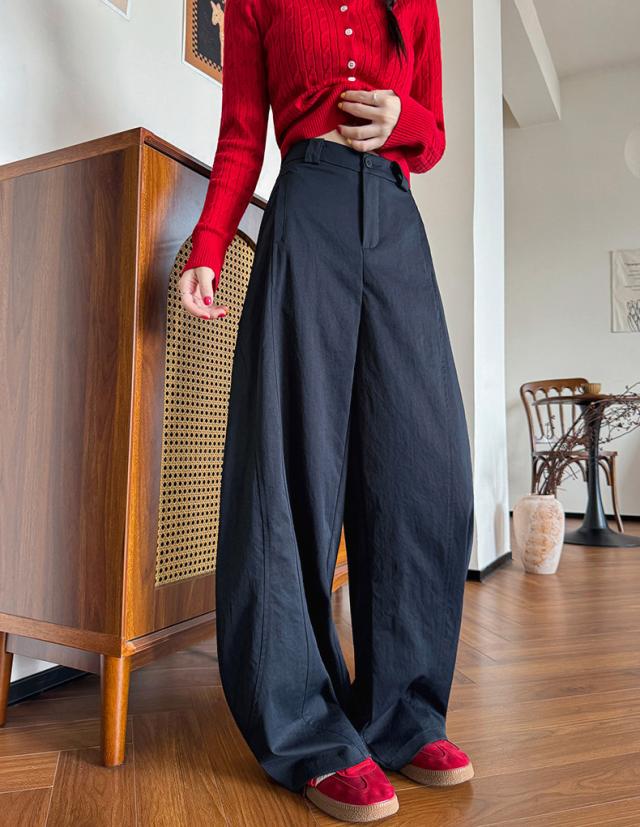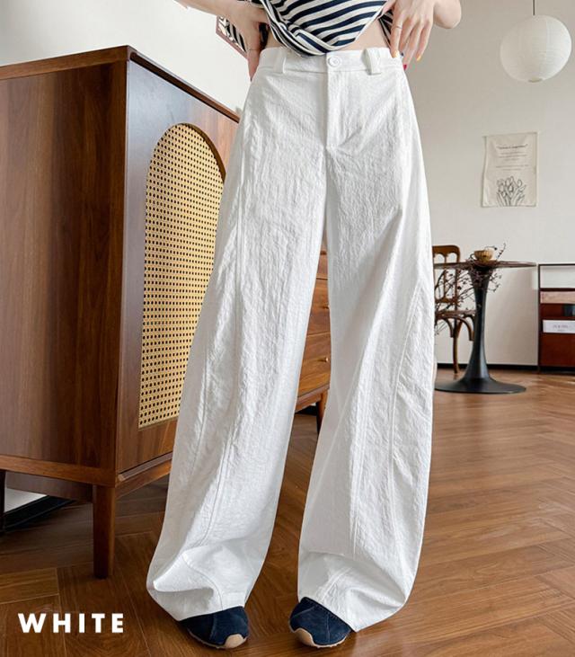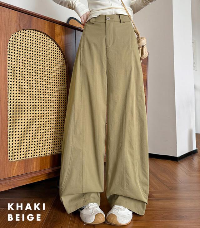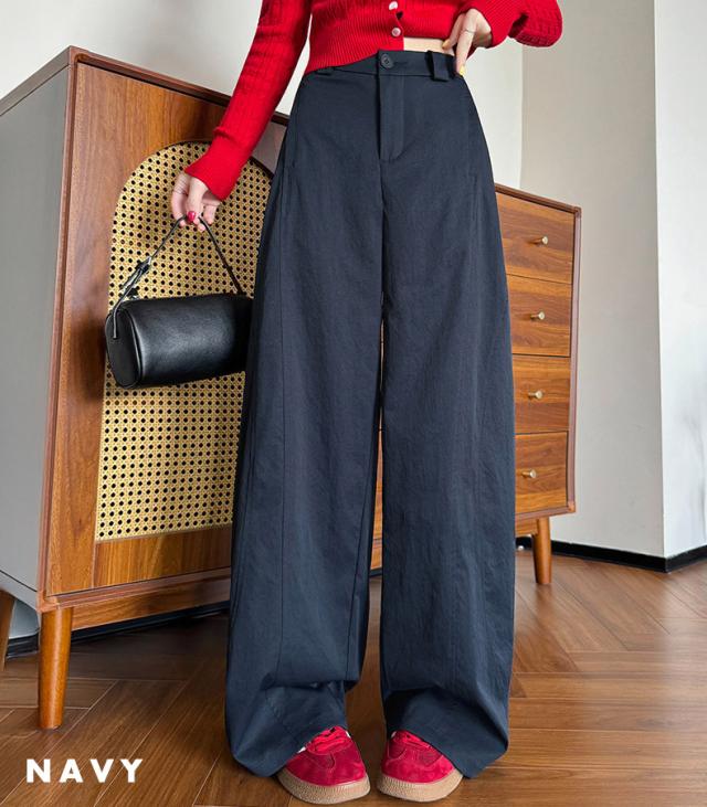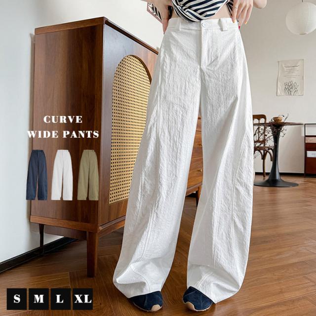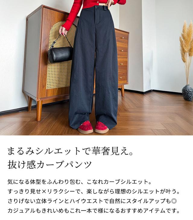 「楽に脚長魅せ!」カーブパンツ レディース ボトムス ワイド ロングパンツ ゆるパンツ ハイウエスト ゆったり バックウエストゴム ボタン ファスナー ベルトループ サイドポケット リラクシー 普段着 体型隠し 薄手 無地 黒 春 夏 秋
