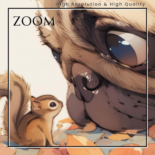 紅葉の秋に栗鼠(リス)と戯れるパグ犬の子犬の姿が可愛すぎるアートポスター作品です。