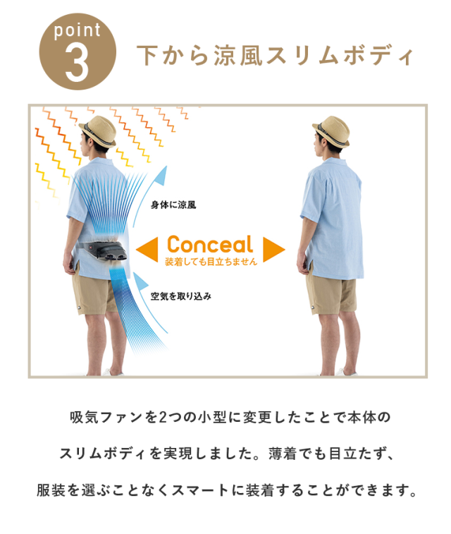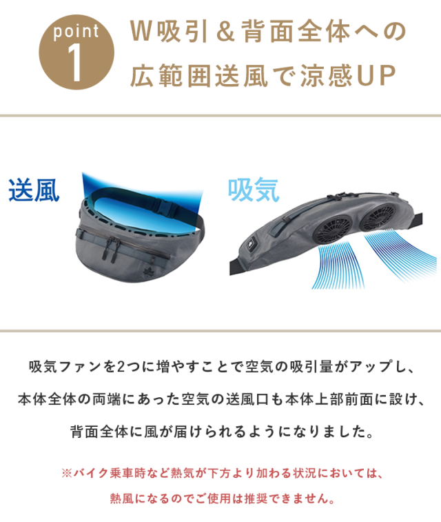 【小型の吸気ファン2つのW吸引&背面全体への広範囲送風で涼感UP】