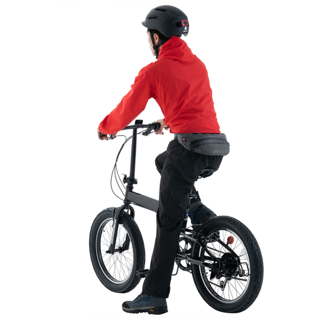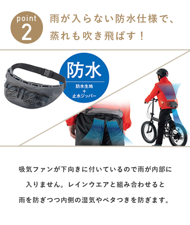 吸気ファンが下向きに付いているので雨が内部に入りません。レインウエアと組合せると雨を防ぎつつ内側の湿気やベタつきを防ぎます。