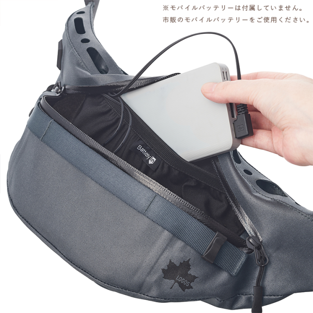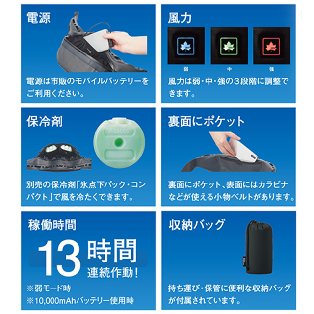 電源となる市販のモバイルバッテリーが入るポケットや、持ち運びや保管に便利な収納バッグが付いているほか、風力は3段階調整可能。