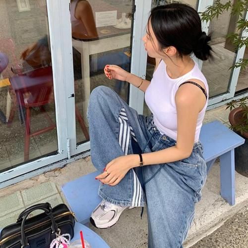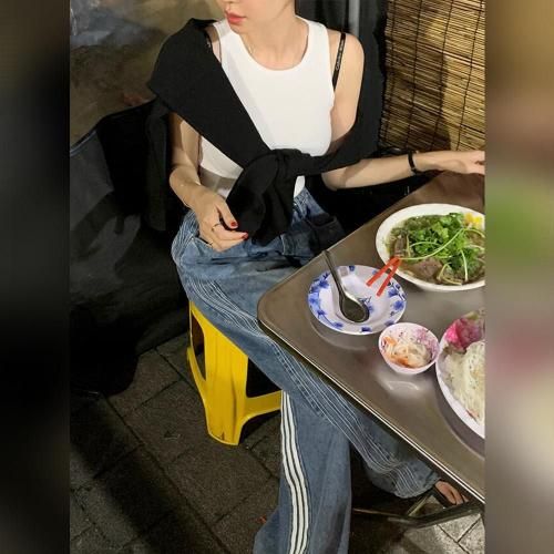 両サイドに施された白い3本ラインが、トラックスーツのようなスポーティなムードを演出し、縦のラインを強調します。